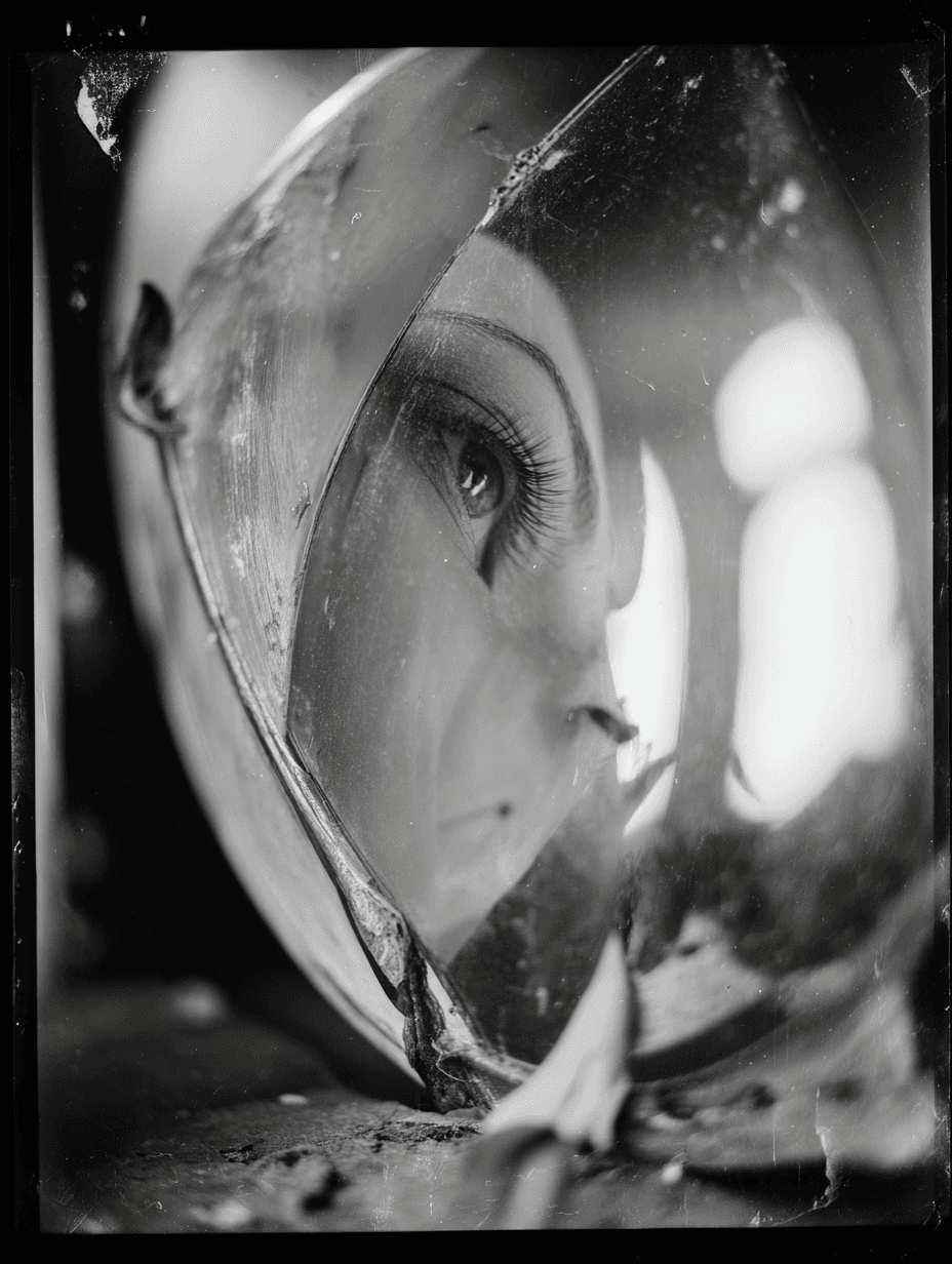 Created with Midjourney V6 (raw). Shadows refined in Lightroom to preserve the fragile transitions between emergence and disappearance. Final tonal shaping in Photoshop, allowing subtle fractures, soft distortions and faint internal glows to remain visible beneath the surface, like layers of memory that cannot be erased.